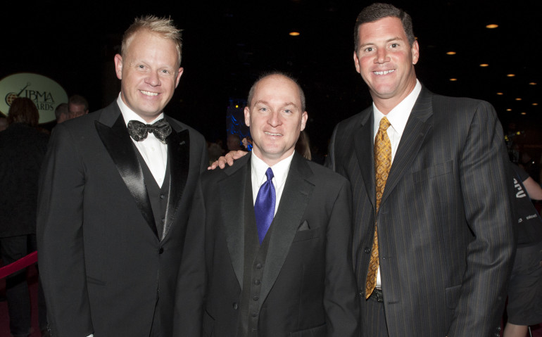 Dailey & Vincent pause for a photo with BMI’s Mark Mason at the 2011 IBMA Awards Nominees Press Reception, sponsored by BMI (Photo by Erika Goldring)