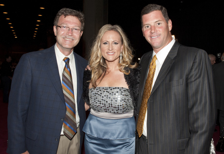 The IBMA’s Dan Hayes, IBMA Songwriter of the Year Nicole Witt, and BMI’s Mark Mason smile for the camera at the 2011 IBMA Awards Nominees Press Reception. (Photo by Erika Goldring)