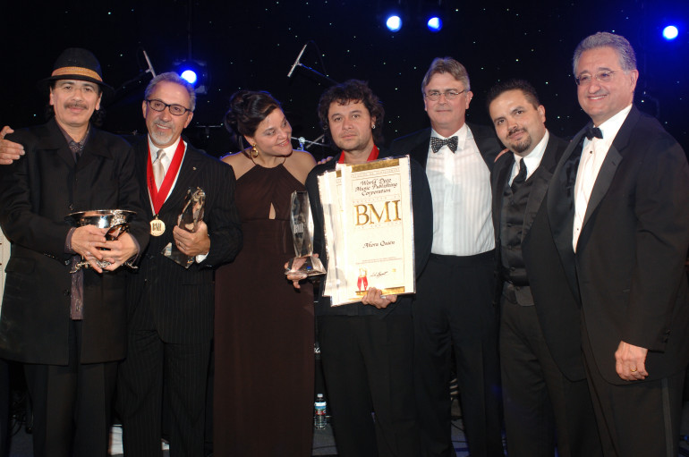 BMI Icon Carlos Santana, BMI Latin Songwriter of the Year Emilio Estefan, BMI AVP of Latin Music Diane Almodovar, BMI Latin Songwriter of the Year Estafano, BMI Senior VP Phil Graham, SER-CA's Servando Cano named BMI Latin Publisher of the Year, and BMI President & CEO Del Bryant gather on stage after the 12th Annual BMI Latin Awards in Las Vegas