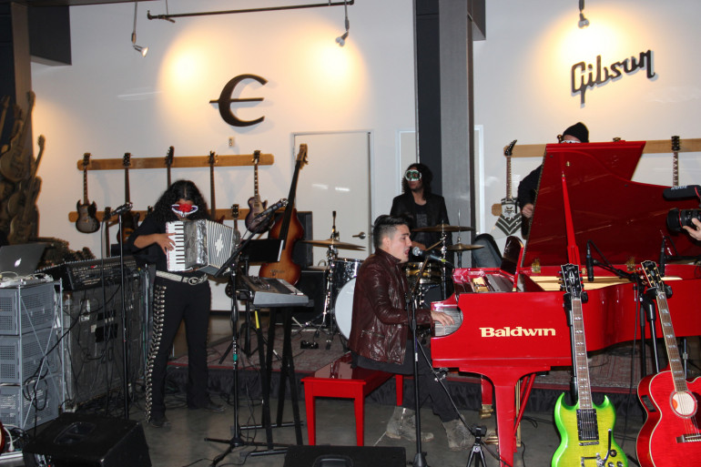 Mitre performing the emotional ballad “Lloro” during the album release party at the Gibson Brands showroom.