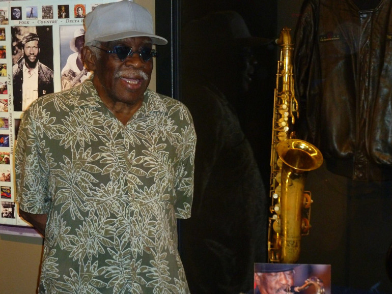 Legendary Mississippi blues tenor saxophone player Eddie Shaw stands next to his instrument, housed in the Blues Hall of Fame. (Photo by Alan Maites)
