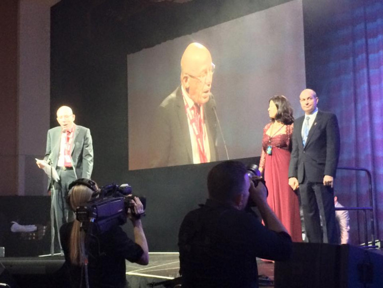 Blues Foundation Board Chair Eric Simonsen honors Jay Sieleman during the Blues Music Awards, who is retiring as President and CEO.