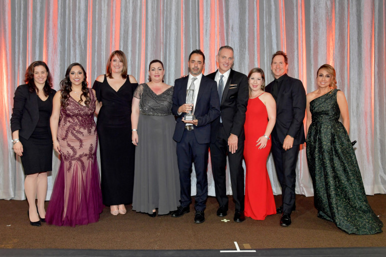 BMI President and Chief Executive Officer Michael O'Neill (4th from R) and BMI Vice President of Latin Music Delia Orjuela (R) present the Publisher of the Year Award to (from L) VP Business and Legal Affairs at Sony/ATV Music Publishing Nicole Giacco, Sony/ATV Music Publishing Manager, Creative Yendi Rodriguez, VP Business Development Latin America & US Latin at Sony/ATV Music Publishing Veronica Vaccareza, Sony/ATV Music Publishing Senior Director, Administration Aireen Hevian, President of Sony/ATV Music Publishing Latin America and U.S. Latin Jorge Mejia, VP, Synch & New Business at Sony/ATV Music Publishing Amy Roland, SVP Business & Legal Affairs at Sony/ATV Music Publishing Jonas Kant onstage during the 25th Annual BMI Latin Awards at Regent Beverly Wilshire Hotel on March 20, 2018 in Beverly Hills, California. (Photo by Lester Cohen/Getty Images for BMI)