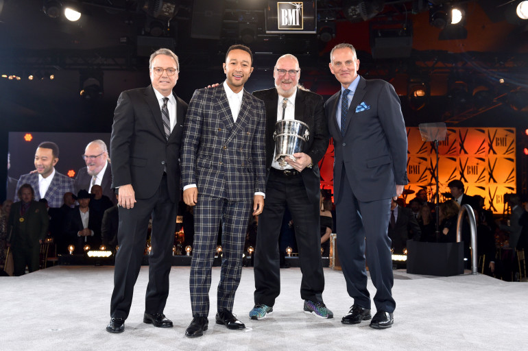 BMI Vice President Creative Jody Williams, John Legend, Steve Cropper and BMI President & CEO Mike O'Neill onstage at the BMI Country Awards 2018 on November 13, 2018 in Nashville. (Photo by John Shearer /Getty Images for BMI)