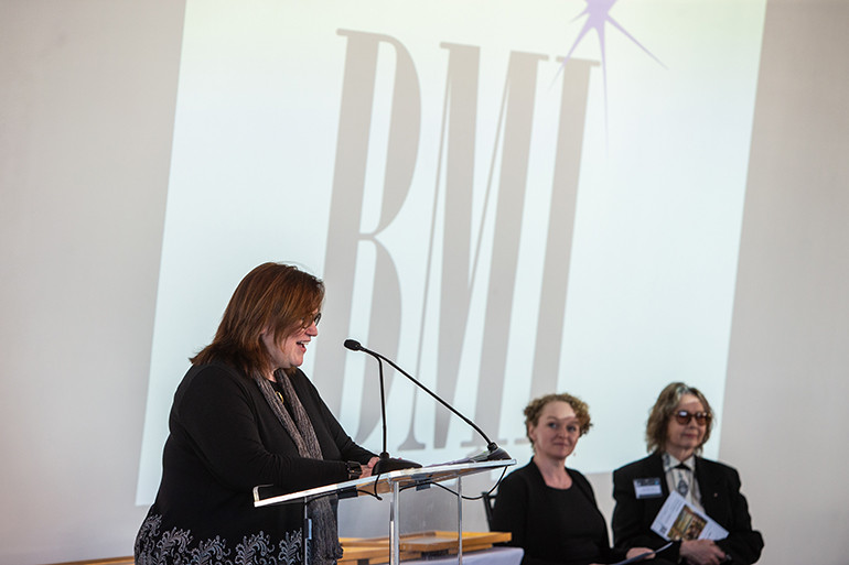 Ann Sweeney, BMI Senior Vice President of International and Global Policy, warmly congratulates the 2019 BMI Student Composer Award recipients. (Photo by Amanda Stevens for BMI)