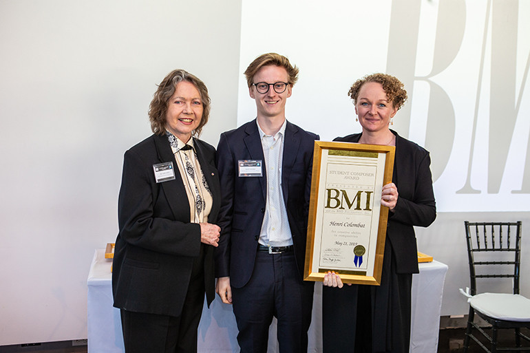 Henri Colombat poses with his BMI Student Composer Award alongside BMI Student Composer Awards Chair Ellen Taaffe Zwilich (left) and BMI Foundation President Deirdre Chadwick (right). (Photo by Amanda Stevens for BMI)