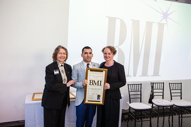 Marco-Adrián Ramos Rodríguez, recipient of the William Schuman Prize, poses with his BMI Student Composer Award alongside BMI Student Composer Awards Chair Ellen Taaffe Zwilich (left) and BMI Foundation President Deirdre Chadwick (right). (Photo by Amanda Stevens for BMI)