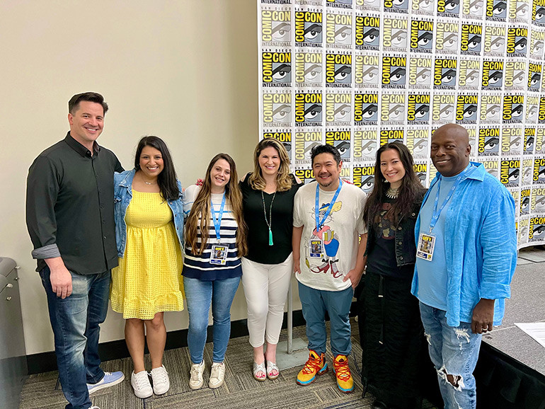 (L-R) Chris Bacon, BMI’s Reema Iqbal, Alix Becq Weinstein, Jana Davidoff, Eric Bauza, Sherri Chung, and Kurt Farquhar pose for a photo before Rhapsody PR’s 15th annual “Behind-The-Music” panel at Comic-Con on Thursday, July 20, 2023 in San Diego, CA.