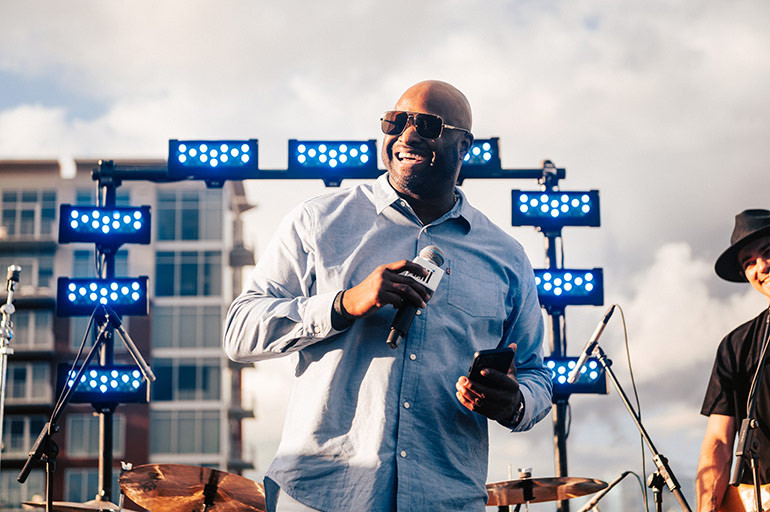 BMI’s Shannon Sanders greets the crowd and introduces Rooftop on the Row artists Willie Jones, Reyna Roberts and RVSHVD. (Photo by Nathan Zucker for BMI)