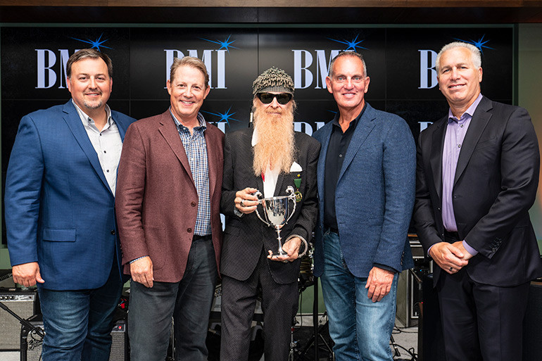 BMI's Mason Hunter, BMI's Clay Bradley, Billy F Gibbons, BMI's Mike O’Neill, and BMI's Mike Steinberg celebrate at the BMI Troubadour Awards. (Photo by Erika Goldring for BMI.)