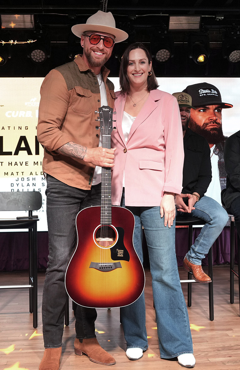 Josh Melton poses with BMI’s MaryAnn Keen after receiving first-time BMI No.1 custom Taylor 210e DLX guitar for Dylan Scott’s “Can’t Have Mine (Find You A Girl).” (Photo by Larry McCormack.)