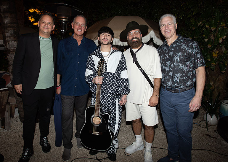 (L-R) Gustavo Lopez, BMI’s Mike O’Neill, Calle 24, and BMI’s Jesus Gonzalez and Mike Steinberg during BMI’s Sunset Sessions at Soho Beach House in Miami on March 5, 2025. (Photo by Natalia Aguilera for BMI.)