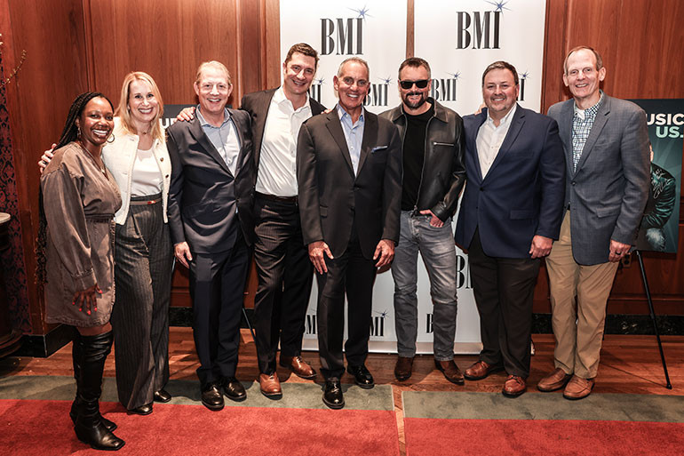(L to R): BMI executives Lyndsey McFail, Liz Fischer, Clay Bradley, Michael Collins and BMI’s CEO & President Mike O’Neill, pose with Eric Church and BMI’s Mason Hunter and Dan Spears after “BMI Presents an Evening with Eric Church” in DC on March 26, 2025. (Photo by Jati Lindsay for BMI.)
