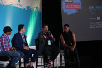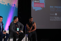 BMI singer-songwriters J. Balvin (left) and Justin Quiles (far right) pictured during the New Latin Urban Movement panel. View Photo