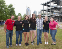 The Texas Roadhouse crew gathers for a photo with Josh Thompson at the BMI Tailgate Party during CMA Festival outside LP Field on June 5, 2014, in Nashville, TN. View Photo