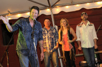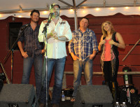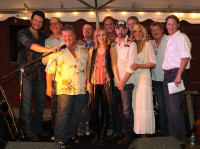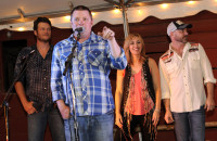 Pictured at the mic during the “Drink On it” and “Over You” No. 1 party is “Drink On It” co-writer Jon Randall. Also pictured are (l-r) Blake Shelton and “Drink On It” co-writers Rodney Clawson and Jessi Alexander. View Photo