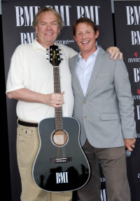 Al Anderson poses with his new BMI special edition Takamine guitar and BMI’s Clay Bradley at the “Love’s Gonna Make it Alright” No. 1 party. View Photo