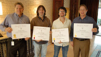 Keith Urban thanks the team behind the No. 1 song “Long Hot Summer.” Pictured are producer Dann Huff, co-writer Richard Marx, Urban, and BMI’s Jody Williams. View Photo