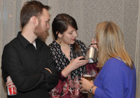 Caitlin Rose and manager Aaron Hartley examine Rose’s mom’s No. 1 silver cup at the BMI party celebrating Liz Rose’s fourth No. 1 hit, “Crazy Girl.” View Photo