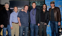 Co-writer Dylan Altman tries out his new special edition Takamine guitar at the “Barefoot Blue Jean Night” No. 1 party. Also pictured are Jake Owen and co-writers Terry Sawchuk and Eric Paslay. View Photo