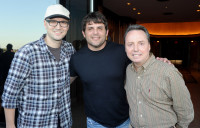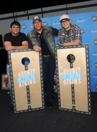 Rodney Atkins (center) presents custom-made cornhole boards to “Take a Back Road” songwriters Rhett Akins (left) and Luke Laird at the song’s no. 1 party on Monday, October 3 at BMI. View Photo