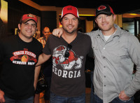 Fellow peach-picker Dallas Davidson (center) congratulates Rhett Akins and Ben Hayslip on their no. 1 song “Honey Bee.” View Photo