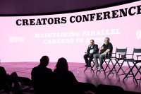 Mark Isham and the SCL’s Ashley Irwin during the “Maintaining Parallel Careers in Music with Mark Isham” panel during the 2023 Nashville Film Festival at Arc Studios on Friday, September 29. View Photo