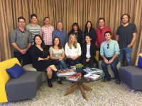 Composer fellows Bijan Olia, Sergei Stern and Jesi Nelson take a photo during the impactful “Business of Film Music” at the Sundance offices in LA. View Photo