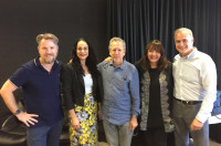 White Bear PR co-founder Thomas Mikusz; ABC’s Senior Vice President, Music, Dawn Soler; Sundance Film Music Program Director and BMI composer Peter Golub; BMI Vice President Film, TV & Visual Media Relations, Doreen Ringer-Ross; and Costa Communications owner Ray Costa pause for a photo after insightful discussions at the Sundance Institute. View Photo