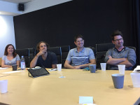 Composer fellows Cindy O’Connor, Jackson Greenberg, Adam Schoenberg and Ryan Rumery enjoy the discussions. View Photo