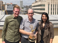 BMI’s Chris Dampier and Reema Iqbal flank 2017 Creative Arts Emmy winner Jeff Beal at his studio in Los Angeles. View Photo