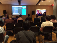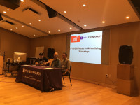 BMI composer Mac Quayle addresses the audience during the NYU/BMI Television Scoring Workshop as BMI composer Mark Suozzo looks on. View Photo