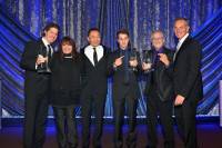 (L-R) Composer A. Patrick Rose, BMI Vice President of Film and Television Relations Doreen Ringer-Ross, assistant Vice President of Film and Television Relations at BMI Ray Yee, composers Will Walden and Snuffy Walden and BMI president and CEO Mike O’Neill pose with the BMI Film Music Award for “Under the Dome” onstage during the 2015 BMI Film & Television Awards… View Photo