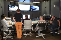 Fellows and advisor Mark Suozzo gather at soundboard to assess recording output during BMI/NYU's three-day Workshop for Music in Advertising. View Photo
