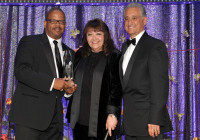 Classic Contribution Award recipient Terence Blanchard, Vice President, Film/TV Relations Doreen Ringer Ross and BMI President & CEO Del Bryant pose onstage during the 2010 BMI Film/TV Awards held at the Beverly Wilshire Hotel on May 19, 2010 in Beverly Hills, California. View Photo