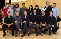 BMI’s Conducting for the Film Composer Workshop class of 2009 pauses for a photo. Pictured (l-r) are (front row) Marco D’Ambrosio, Anton Sanko, iZLER, Lucas Richman, Rob Simonsen and Philip White; (back row) editor Chris Ledesma, contractor David Low, David Buckley, Vivek Maddala, Rebecca Contreras, BMI’s Doreen Ringer Ross and Philip Shrut, Tim Jones and BMI’s Ray Yee. View Photo