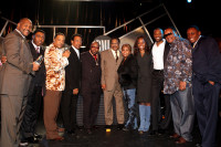 All of the afternoon's honorees huddled together for a group shot. Pictured are (l to r): Pastor Marvin Winans, Mighty Clouds of Joy members Michael Cook, John Valentine, Richard Wallace, Ron Staples and Joe Ligon, Vanessa Bell Armstrong, BMI's Catherine Brewton and Wardell Malloy, "Um Good" songwriter Percy Bady and BMI's Malik Levy. View Photo