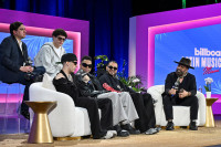 (Top, L-R) Alexis Fierro “Chachito,” Armenta, (Bottom, L-R) Albert Hype, Caleb Calloway, Álvaro Díaz, and Jesus Gonzalez during BMI’s “How I Wrote That Song” panel at Billboard Latin Music Week at The Fillmore in Miami Beach on Tuesday, October 15, 2024. View Photo