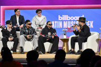 (Top, L-R) Alexis Fierro “Chachito,” Armenta, (Bottom, L-R) Albert Hype, Caleb Calloway, Álvaro Díaz, and BMI’s Jesus Gonzalez during BMI’s “How I Wrote That Song” panel at Billboard Latin Music Week at The Fillmore in Miami Beach on Tuesday, October 15, 2024. View Photo