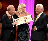 (L-R) President/CEO of Sony/ATV Music Publishing Nashville Troy Tomlinson, honoree Taylor Swift, and Sony/ATV CEO Martin Bandier pose with award onstage at The 64th Annual BMI Pop Awards, honoring Taylor Swift and songwriting duo Mann & Weil, at the Beverly Wilshire Four Seasons Hotel on May 10, 2016 in Beverly Hills, California. View Photo