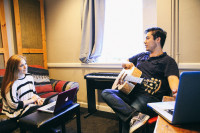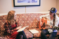Songwriters Kayla Woodson and Daniel Ethridge discuss the details of their chorus in one of the three songs written in just one day of the Belmont writers retreat. The students took every opportunity they had to collaborate with their fellow writers. View Photo