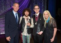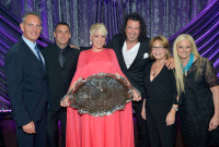 (L-R) BMI President & CEO Mike O’Neill, Carey Hart, honoree P!nk, songwriter Billy Mann, Judith Moore and BMI vice president & general manager, writer/publisher relations Barbara Cane pose with the BMI President’s Award onstage during the 63rd Annual BMI Pop Awards held at the Beverly Wilshire Hotel on May 12, 2015 in Beverly Hills, California. View Photo