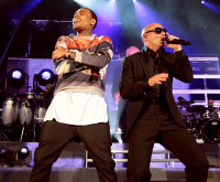 Pitbull and fellow BMI member Chris Brown share a moment onstage during Pitbull's concert at the Hollywood Bowl in Los Angeles. View Photo