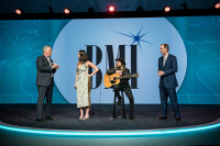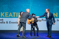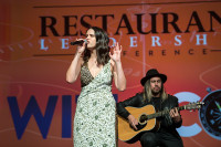 Winsight’s Chris Keating and BMI’s Dan Spears on stage at the Restaurant Leadership Conference with Rozzi and guitarist Daniel Labbe. View Photo