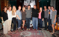 Phil Madeira and friends, including Emmylou Harris, Shawn Mullins, the North Mississippi All Stars, Buddy Miller, Matraca Berg, and Amy Stroup, pause for a photo with the Americana Music Association’s Michelle Aquilato (far left, standing) and Jed Hilly (second to right, standing) at the Nashville Downtown Presbyterian Church during the Americana Music Festival. View Photo