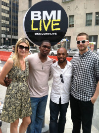 BMI’s Samantha Cox; performer Chris Rob; percussionist Bendji Allonce; and BMI’s Jake Simon pause for a photo after Chris’ set at the third installment of the BMI-sponsored 2nd annual 7 World Trade Center Festival, July 13 in New York. View Photo
