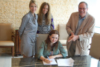 BMI’s Samantha Cox, Brooke Morrow and Charlie Feldman flank Academy Award-nominated actress and singer/songwriter Abigail Breslin as she signs a BMI songwriter affiliation agreement in New York. Breslin, known for her roles in such movies as Little Miss Sunshine and New Year’s Eve, has also written a song for her upcoming movie, Perfect Sisters. View Photo