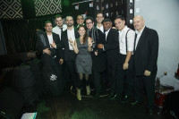 BMI’s Samantha Cox (far left) and Brandon Haas (far right) share a high five after VÉRITÉ’s (center) performance at the HD Radio and BMI-sponsored CMJ showcase on October 21 at the Knitting Factory in Brooklyn. View Photo