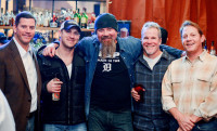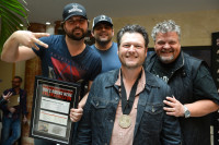 Co-writers Rhett Akins, Dallas Davidson and Craig Wiseman celebrate with Blake Shelton at the “Boys Round Here” No. 1 party. View Photo