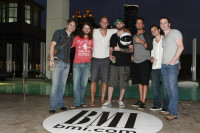 Michael Tolcher, BMI’s Byron Wright, Bryan Gibson, Novel, Darp Studios’ Kimberly Smith and BMI’s David Claassen gather at the BMI ESCAPE Pool Party on August 27. View Photo